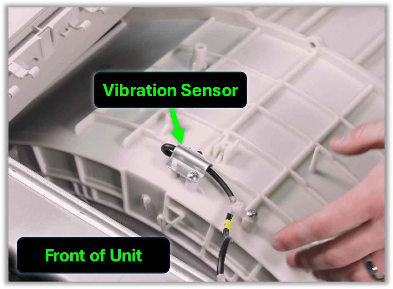 The picture below shows the location of the vibration sensor. It can be found on top of the outer tub towards the front of the unit. If the unit you are working on is a WashTower, the dryer will need to be removed to access the vibration sensor…