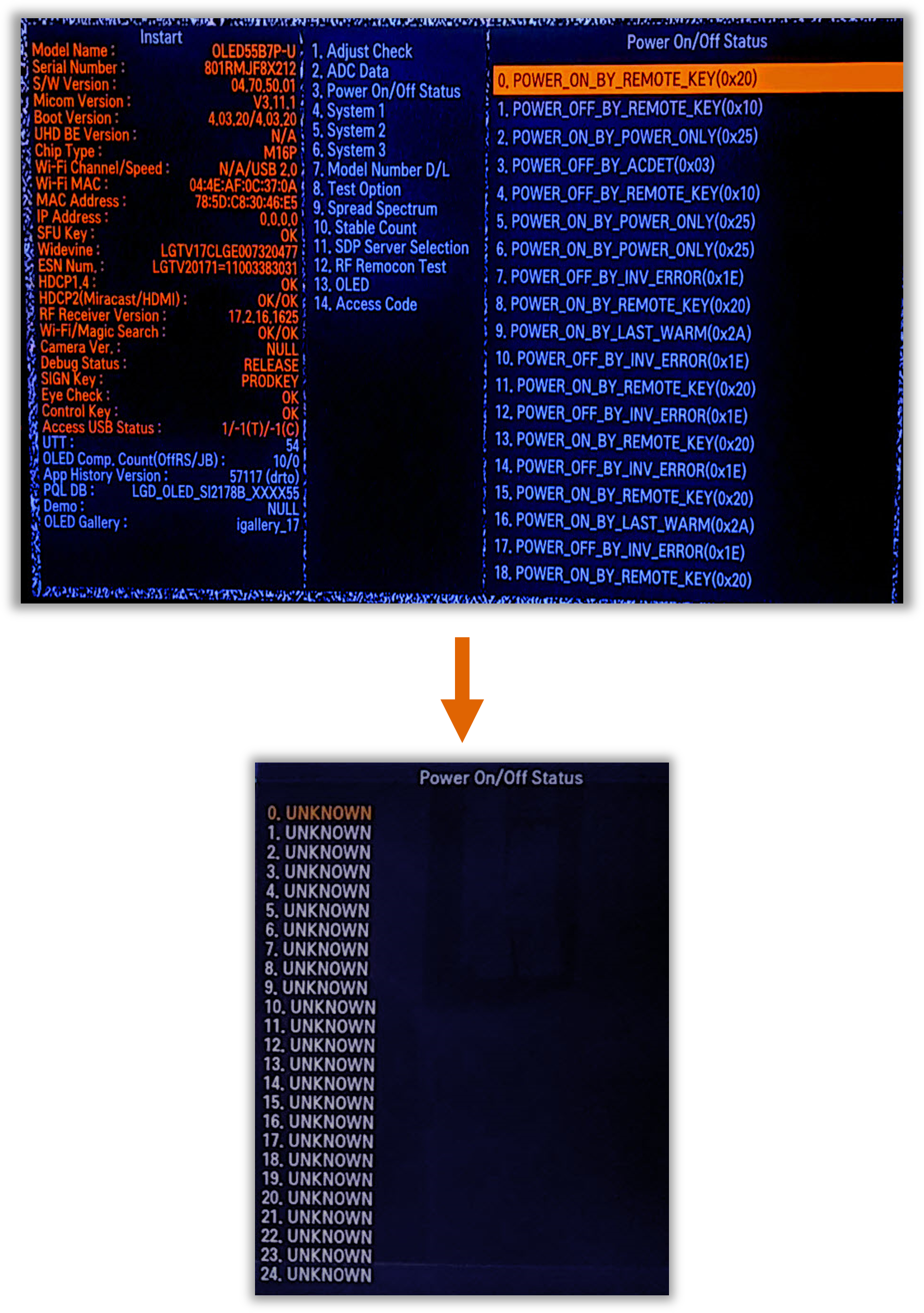 If you need to clear the Power Off History go to the first item, highlight it but do not click on it, then press the “0” key 5 times on the Service Remote. Now the Power Off History items will show as “Unknown”.
